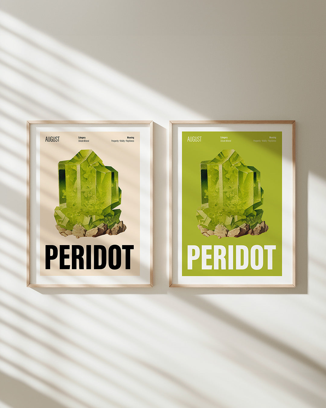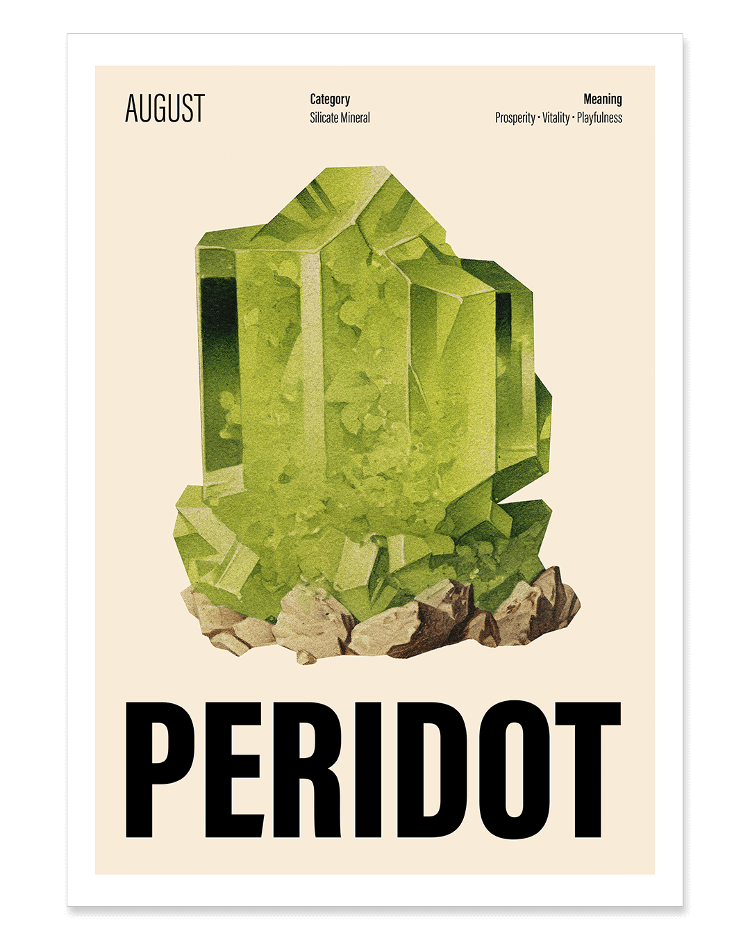 Our vintage-inspired August birthstone poster features a watercolour peridot illustration which combines positive energy with a classic infographic style.