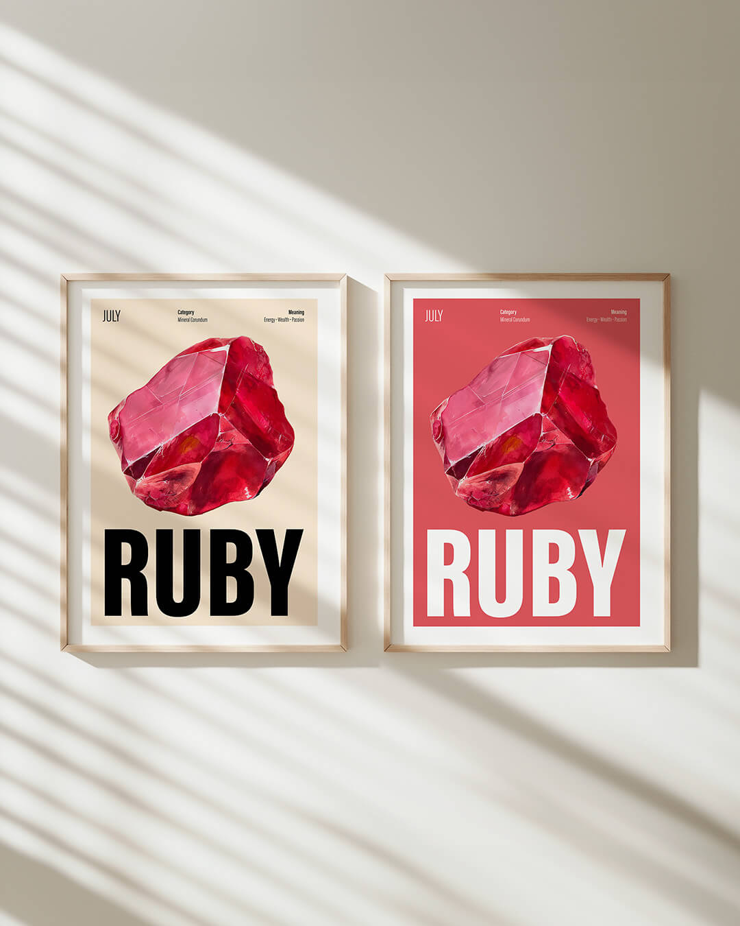 Our vintage-inspired July birthstone poster features a watercolour ruby illustration which combines positive energy with a classic infographic style.