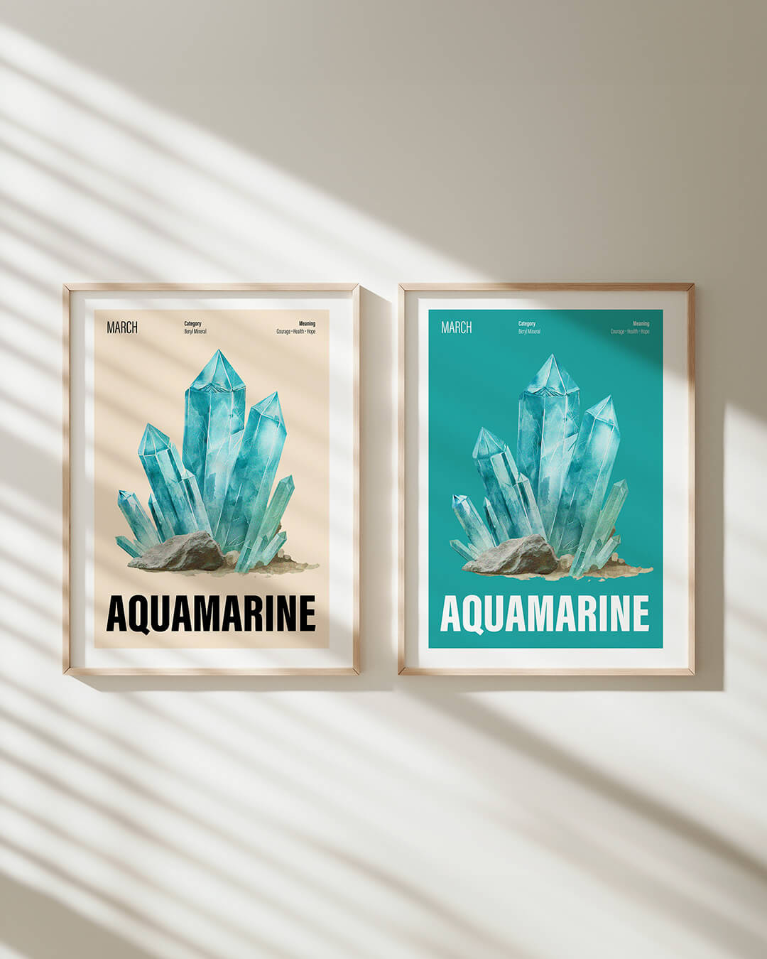 Our vintage-inspired March birthstone poster features a watercolour aquamarine illustration which combines positive energy with a classic infographic style.