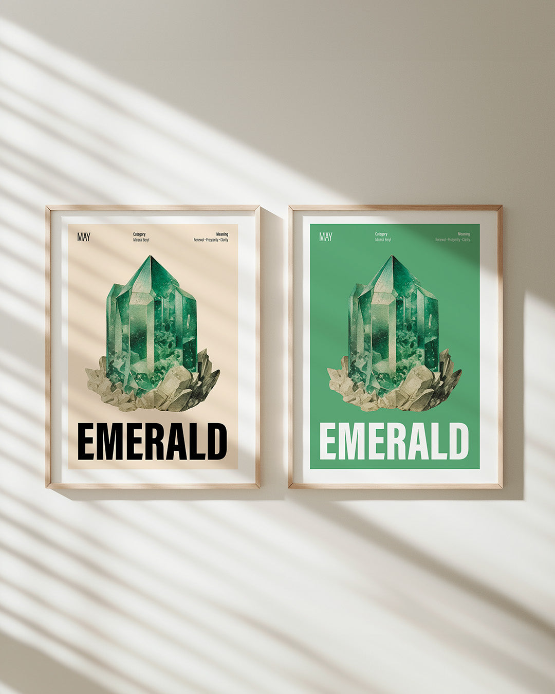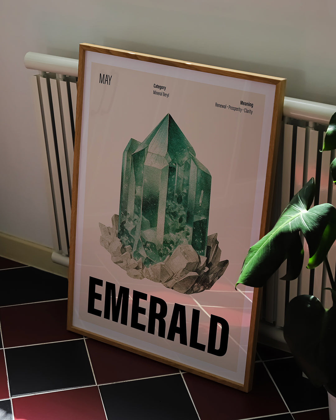 Our vintage-inspired May birthstone poster features a watercolour emerald illustration which combines positive energy with a classic infographic style.