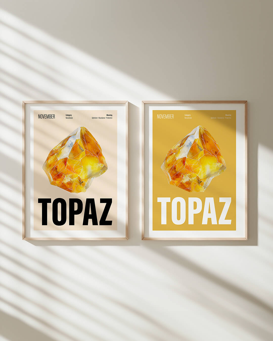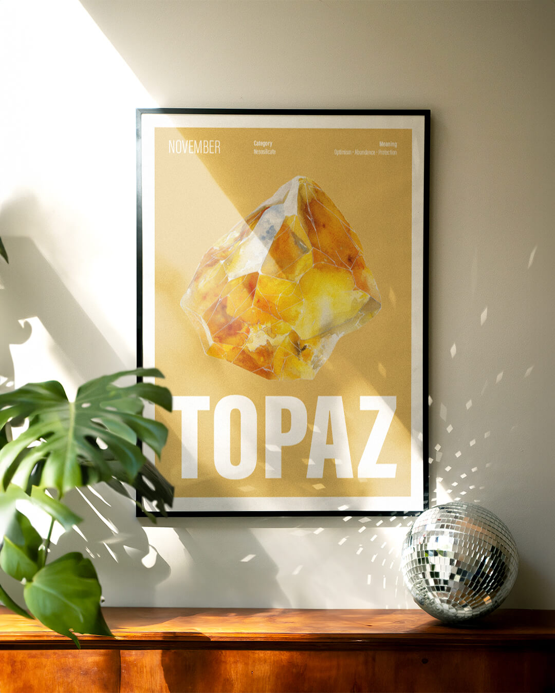 Our vintage-inspired November birthstone poster features a watercolour topaz illustration which combines positive energy with a classic infographic style.
