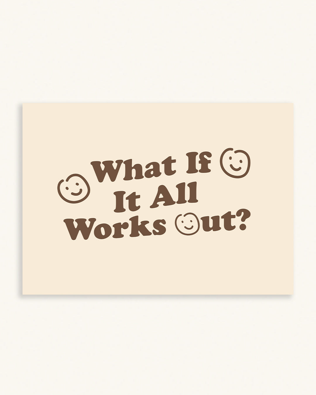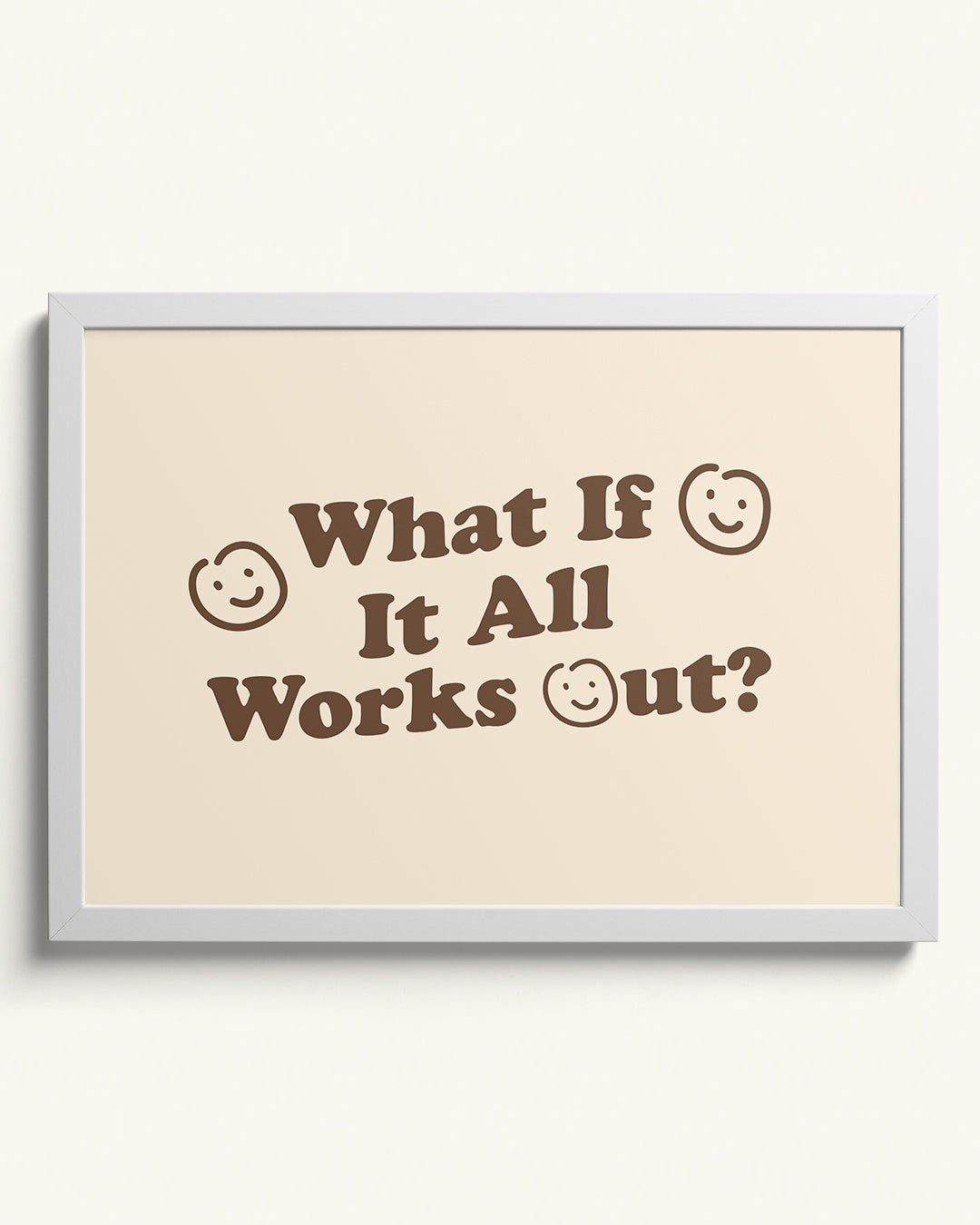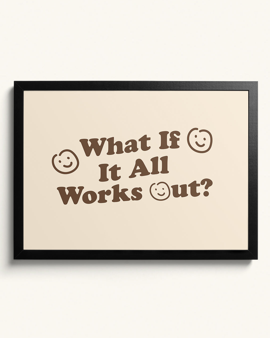 Bring positivity into your space with our modern "What if it all works out?" motivational quote poster. The fun twist of turning the "O" into a smiley face adds a touch of joy to our minimalist design. With a neutral background and cosy brown lettering, our art print fits perfectly with the season.
